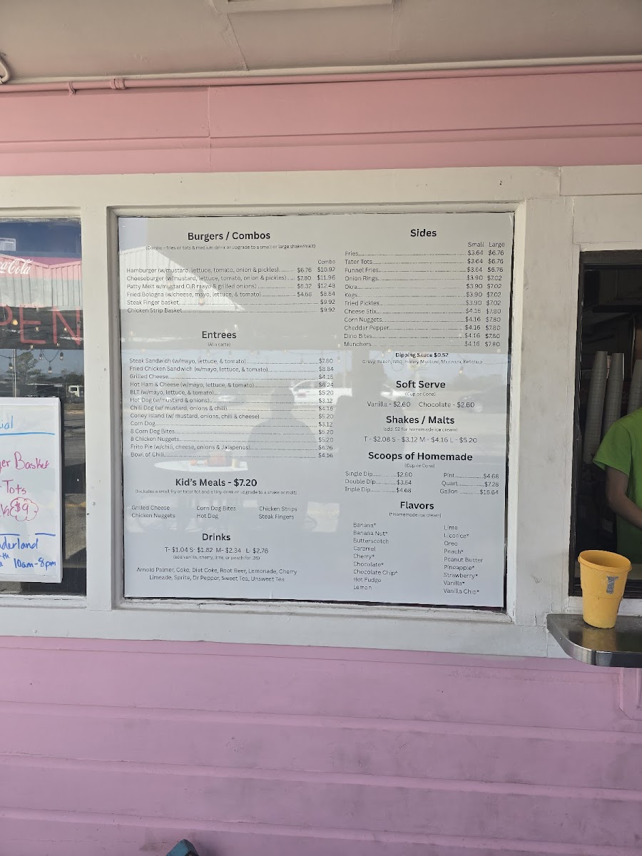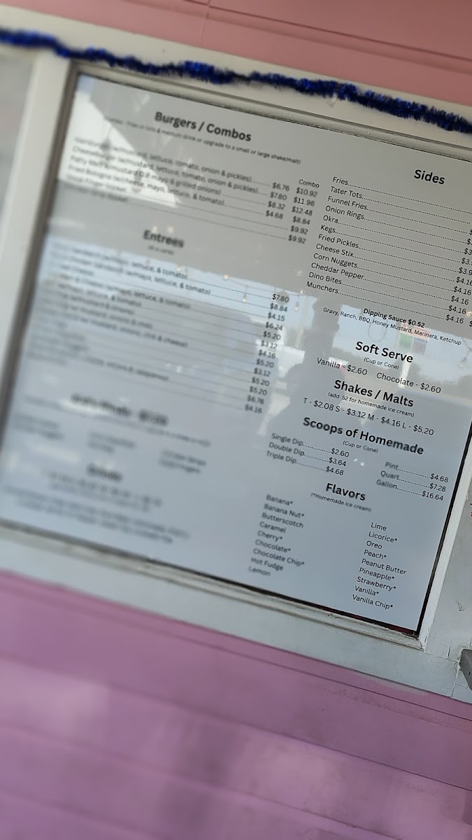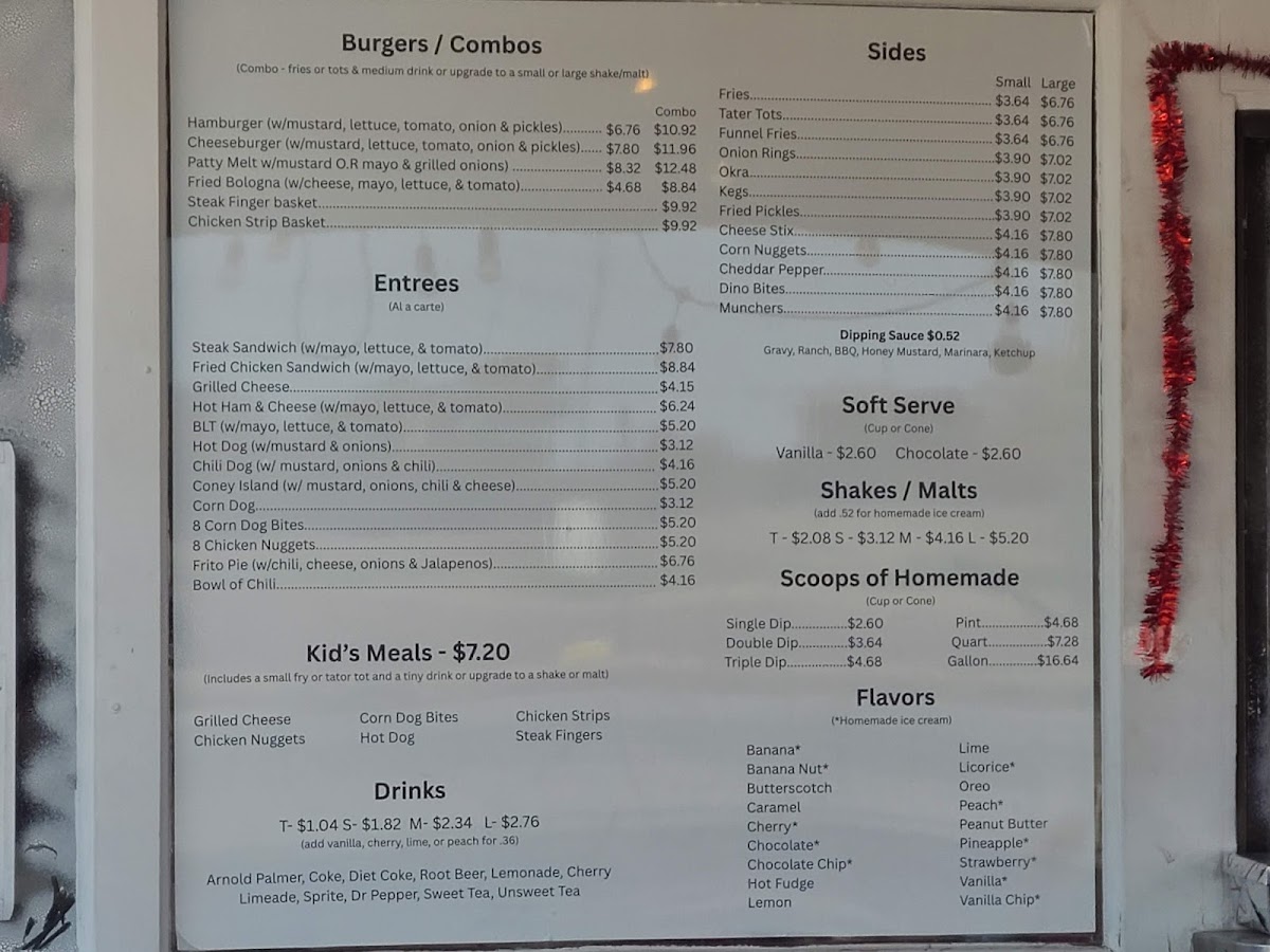 At the heart of the menu are their signature malts and shakes, like the chocolate malt or a refreshing strawberry shake, ideal for a sweet treat any time of day. Savory options such as the chili dog, cheeseburger with cheddar peppers, and crispy chicken chunks provide simple yet hearty choices for a casual meal. For sides, you’ll find everything from tater tots and seasoned fries to jumbo stuffed tater kegs and fried okra, adding a comforting, easygoing element to the experience.